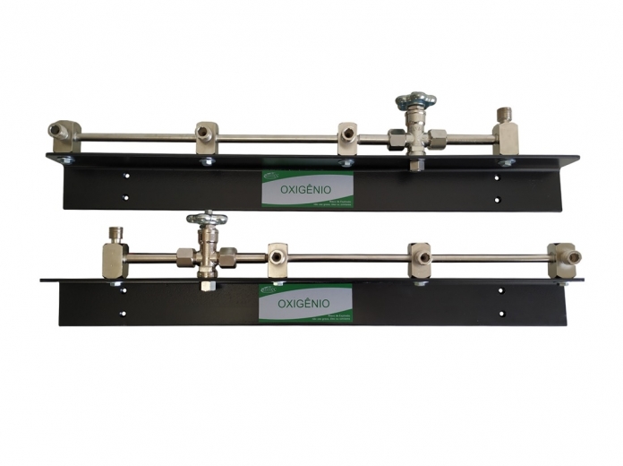 Tubulação em latão niquelado, perfil de ferro com pintura eletrostática de alta resistência, válvulas RTO para o fechamento da rede e serpentinas para conexão com os cilindros. Produto isento de óleo.