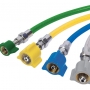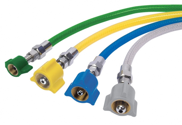 Mangueira de nylon trançado na cor de identificação do gás, com capacidade de até 250 libras de pressão e conectores para rede.